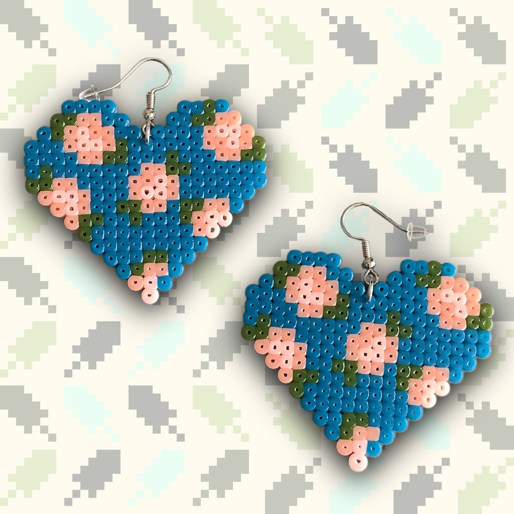 PIXEL FLORAL HEART EARRINGS - BLUE/PINK